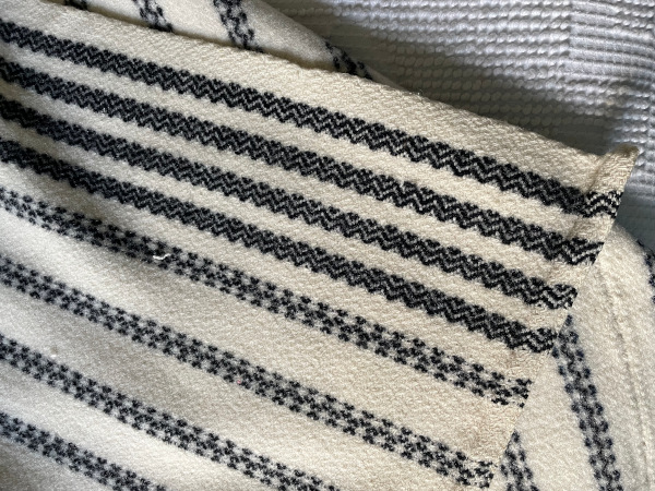 Rare early 19th Century narrow loom Welsh blanket in simple black and cream . Bolder Border