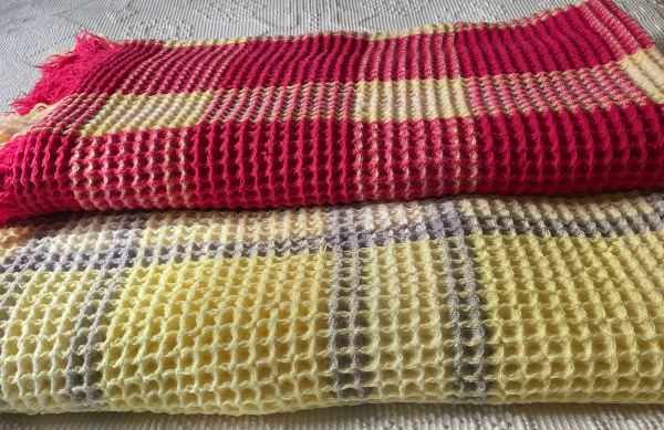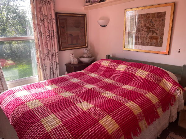 Lovely deep pink with yellow and cream Welsh Honeycomb blanket . Brighten your room !